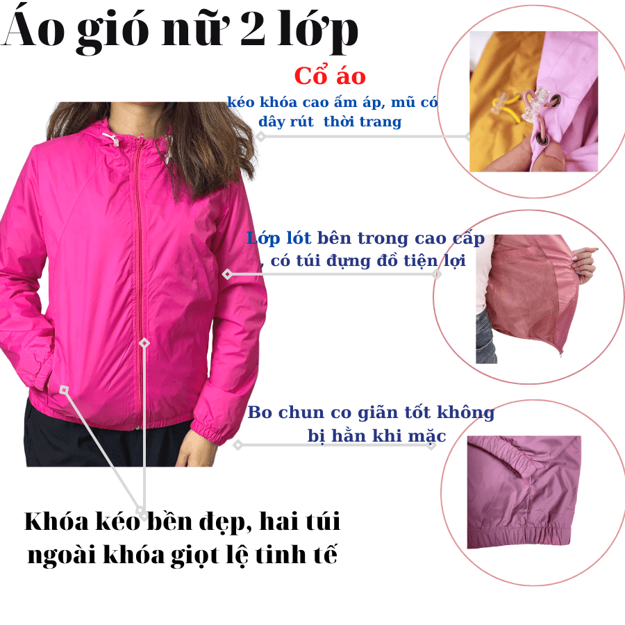 Áo gió nữ 2 lớp VARIO có mũ thời trang, cản gió, chống bụi tốt