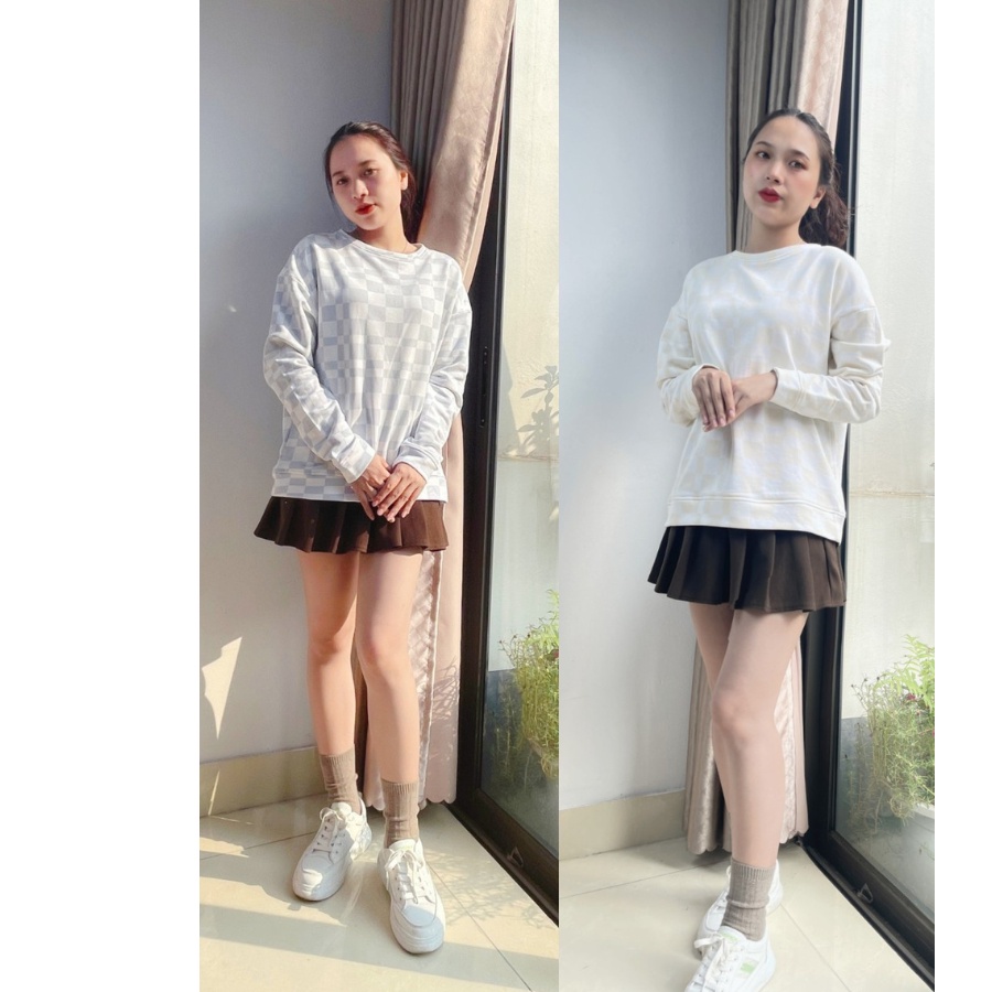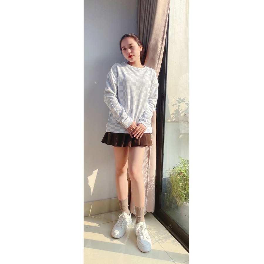 Áo thun nữ VARIO freesize vải nỉ dài tay họa tiết kẻ caro trẻ trung cổ tròn VH22-02